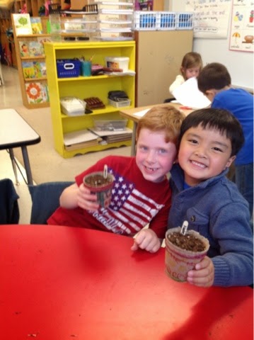 Here are friends decorating a pot. Tomorrow we are going to plant marigolds.