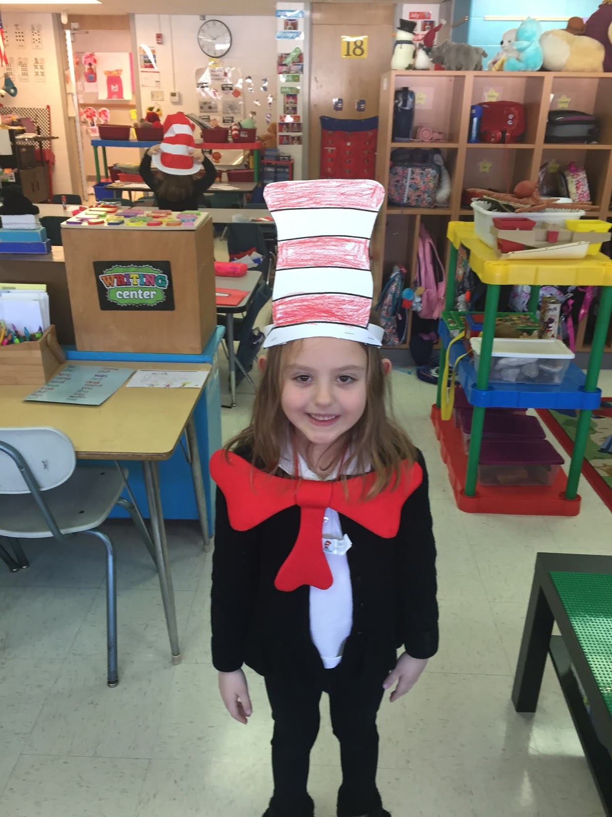 We had a fun day sharing our costumes, sharing our favorite Dr. Suess book, making a hat, making a list of words that rhyme with "cat", reading and finishing rhymes, listening to Dr. Seuss stories and drawing a Cat in the Hat! Check out these cute costumes and/or favorite books.